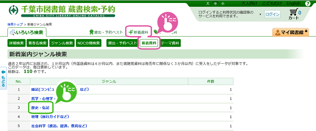ジャンルの分類から資料を探すことができます。いろいろ検索の「ジャンルを探す」から利用します。